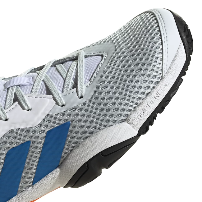 adidas adiPRENE® + soutient la phase de rebond du joueur avec ses propriétés et est utilisé uniquement dans la partie avant de la chaussure. Cet effet peut être comparé à un trampoline. Le matériau a une forme beaucoup plus stable que le matériau classique des semelles EVA, ce qui permet d’obtenir une longue durée de vie de la semelle.