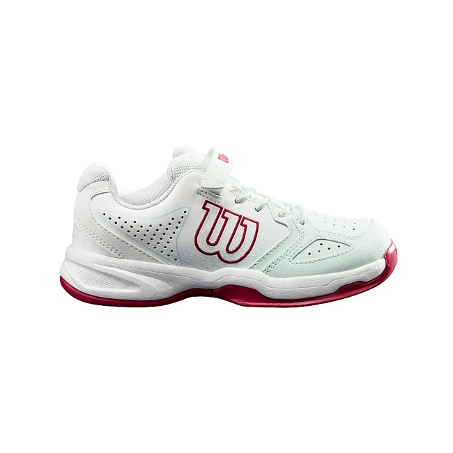 Chaussures de tennis Wilson Kaos K pour bébé, combinaison blanc-rouge, toutes surfaces, pour les plus petits joueurs de tennis, avec lacets élastiques, laçage autobloquant Velcro et technologies de mouvement sûres. Les technologies FS, DF2, R-DST et Duralast de Wilson font de ces petites baskets des chaussures durables, confortables et fiables pour les petits joueurs novices.