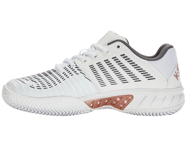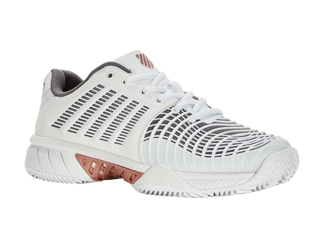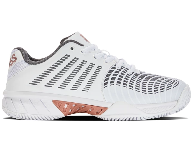 Les Tennis pour femme K-Swiss Express Light 3 HB Blanches sur terre battue pour les joueuses de club exigeantes raviront par leur légèreté, leur résistance, leur stabilité et leur confort exceptionnel. La troisième génération du best-seller de K-Swiss en Europe est livrée avec une tige améliorée. Il est nouvellement équipé de la protection DuraWrap Flex, qui résiste mieux aux glissements et au frottement de la chaussure sur le sol. Le stabilisateur central PSC à 180° renforce la chaussure lors des mouvements de rotation.