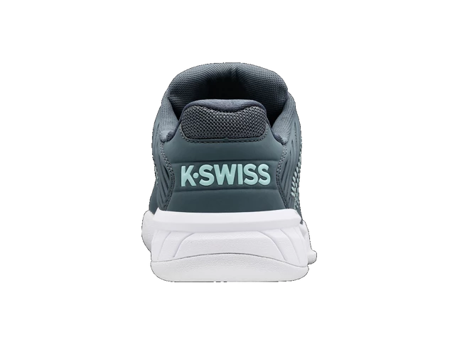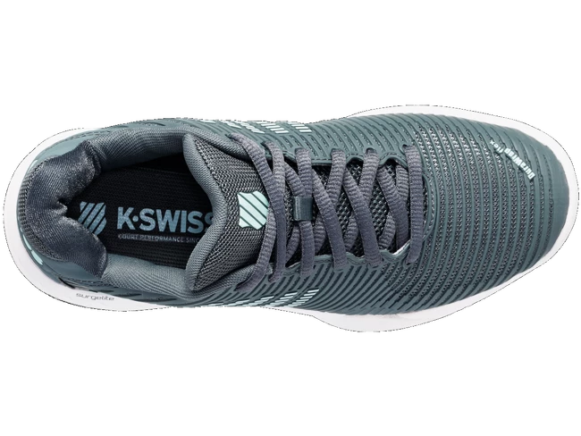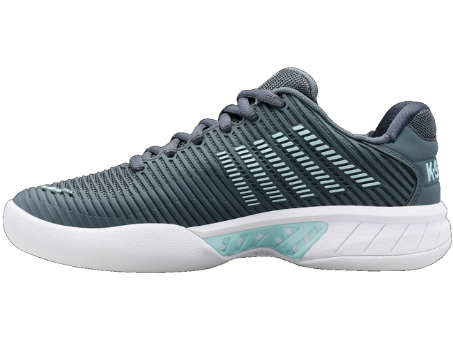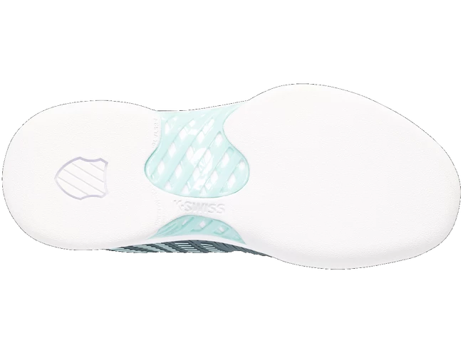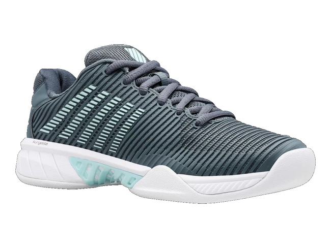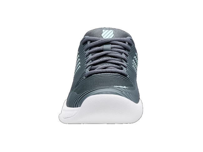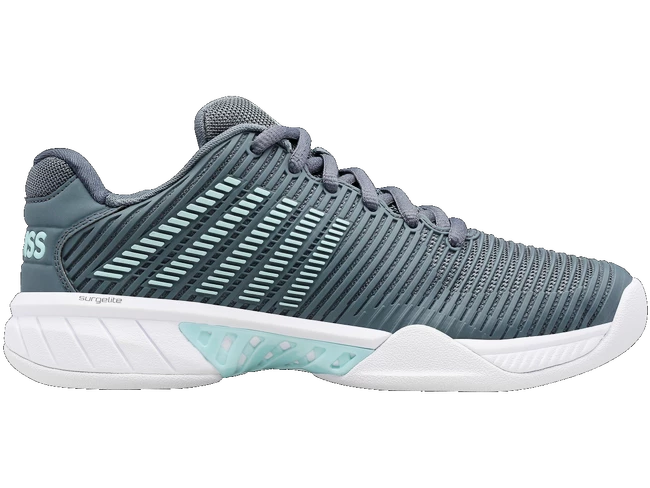 Les chaussures de tennis K-Swiss Hypercourt Express 2 Carpet Stormy Weather/Icy Morn/White pour femmes sont des baskets pour tapis de tournoi. Le modèle de deuxième génération le plus vendu de K-Swiss regorge de technologies telles que SurgeLite pour une accélération extraordinaire, une tige DuraWrap Flex durable et élastique, une semelle en caoutchouc haut de gamme AÖSTA 7.0 ou une construction extérieure sans soudure Seamfree, qui peut résister aux mouvements les plus agressifs sur le court.