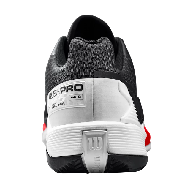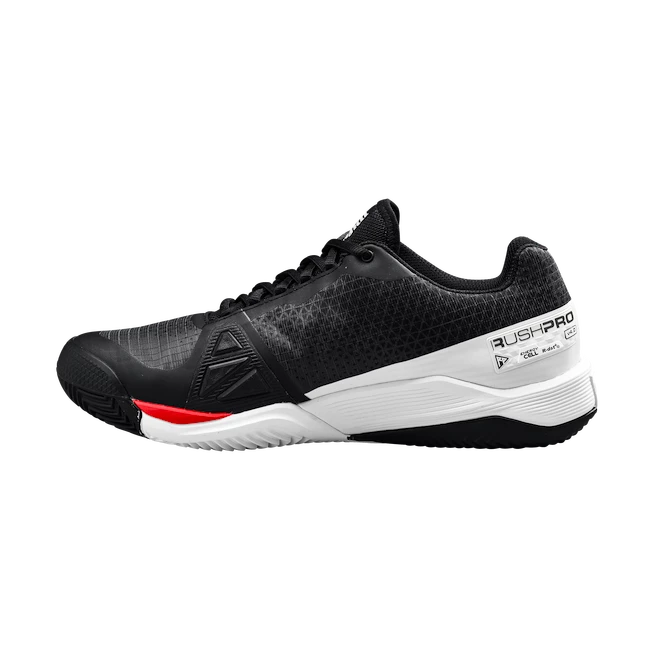 Chaussures de tennis Wilson Rush Pro 4.0 Clay Black/White pour hommes destinées aux joueurs expérimentés et aux joueurs de tournoi dotées des dernières technologies pour une liberté de mouvement optimale sur le court. La série haut de gamme Rush Pro est récemment équipée de la technologie 4D Support Chassis 2.0 de deuxième génération pour une stabilité et une vitesse maximales. La toute nouvelle technologie Energy Surge à l’avant de la chaussure améliore l’accélération du joueur et contribue au confort général lors de prises difficiles.