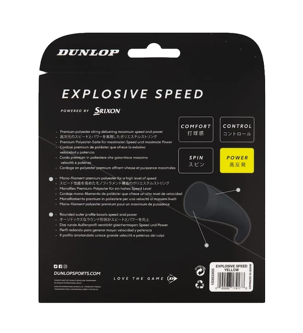 La corde de tennis Dunlop Explosive Speed Black 1.25 Set (12 m) est une corde co-polyester durable axée sur le punch et la force maximum. Jouez des coups de poing plus doux. Cordon en polyester de qualité supérieure offrant une vitesse et une résistance maximales. Polyester premium mono-filament pour haute vitesse. Le profil extérieur arrondi augmente la vitesse et la résistance. Conçu pour les joueurs intermédiaires et de club qui jouent un tennis agressif principalement à partir de la ligne de base. Excellente longueur de balle dans n’importe quelle situation.
