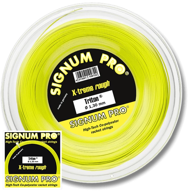 La corde de tennis en polyester Signum Pro Triton 12m se caractérise par une surface rugueuse et granulaire et une perte de tension minimale. Parmi les caractéristiques les plus frappantes de ce modèle figurent le contrôle et la rotation.