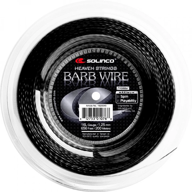 La corde de tennis Solinco Barb Wire (200 m) est un co-polyester moleté moyennement dur avec un très bon spin et une jouabilité facile. Solinco Barb Wire est une ficelle moletée avec laquelle vous générerez un spin incroyable. Pendant que vous jouez, vous le sentirez mordre dans la balle et lui arracher les cheveux à chaque frappe. Barb Wire vous aidera à tourner plus avec moins d’effort. Il est également étonnamment confortable sur le polyester.