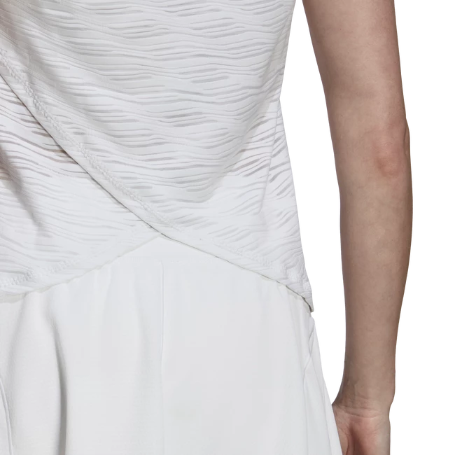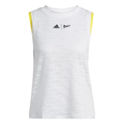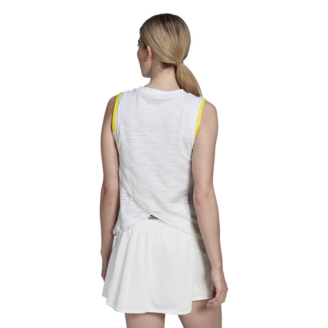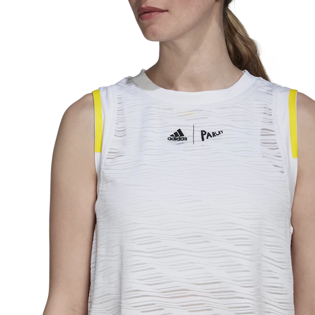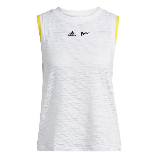 Le débardeur pour femme adidas London Match Tank White de la collection Wimbledon 2022 est fabriqué à partir de matériaux Primeblue recyclés et doté de la technologie Aeroready pour une évacuation parfaite de la transpiration. Ce débardeur de tennis fera comprendre à tout le monde que vous vous battez pour des océans plus propres. Il fait partie de la collection adidas créée pour les courts en gazon du sud-ouest de Londres et est orné de graphismes intégrés mettant en évidence le problème du plastique brûlant de notre planète.