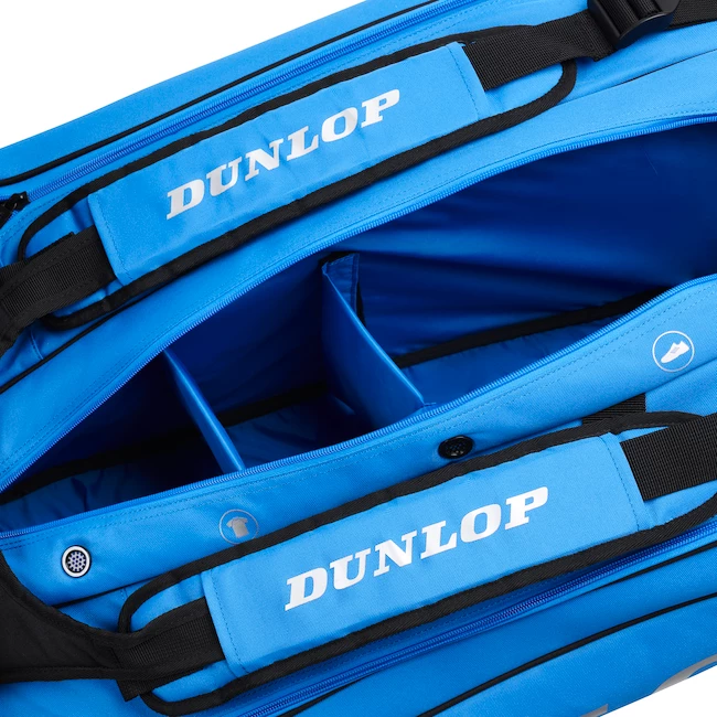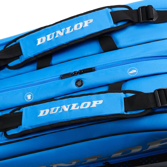 Le sac de tennis Dunlop FX-Performance 12R Black/Blue peut contenir jusqu’à 12 raquettes et dispose de 2 poches frontales pratiques. Le sac peut être porté sur l’épaule ou sur le dos grâce aux deux confortables sangles rembourrées, et il y a une poignée pour le porter à la main. Le compartiment pour les raquettes est équipé d’une isolation thermique, et il existe également un compartiment séparé ventilé pour les vêtements ou les chaussures humides.