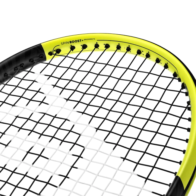 Ĺ’illets centraux de forme spĂ©ciale Les Ĺ“illets Dunlop Spin Boost+ sur 12 cordes longues dans la partie supĂ©rieure de la tĂŞte de raquette permettent aux cordes de se dĂ©placer spĂ©cifiquement en fonction de l’impact de la balle. Si vous frappez la balle avec la moitiĂ© supĂ©rieure de la tĂŞte de raquette, la balle s’enchaĂ®ne de haut en bas sur des coups durs jouĂ©s sur la moitiĂ© de votre corps.