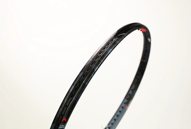 Une caractéristique intéressante de la belle conception de cette raquette est la forme du cadre, respectivement son diamètre variable. Ce dernier n’est pas le même partout, et la largeur est asymétrique avec des dimensions de 20-23-21 mm. Cependant, l’arche inférieure de la tête de raquette au niveau du cou est si mince que vous y mesureriez à peine une largeur de 15 mm, ce qui défie tous les paramètres. Cette nouvelle approche du design est sans aucun doute unique.