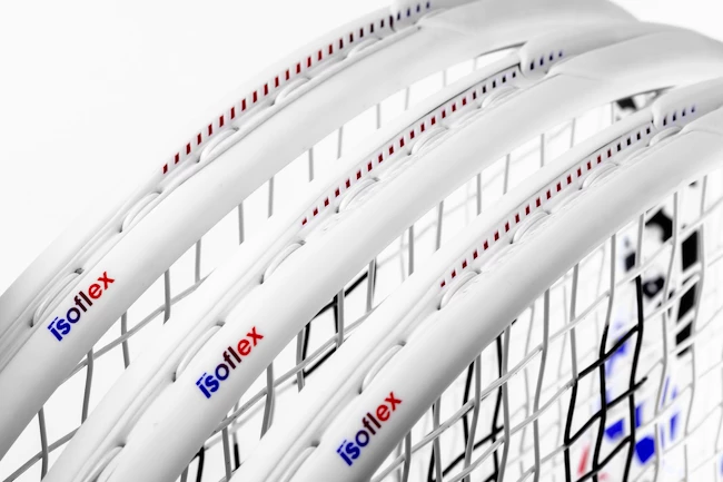 Les Ĺ“illets pour les cordes et la protection du cadre Ă l’extĂ©rieur ont des trous IsoFlex. Ceux-ci permettent Ă la corde d’avoir une plus grande amplitude de mouvement lors de la frappe de la balle. Le cordage est ainsi plus dynamique, gĂ©nère plus d’Ă©nergie, d’effet et grâce Ă cela la balle reste plus longtemps sur le cordage pour plus de contrĂ´le.