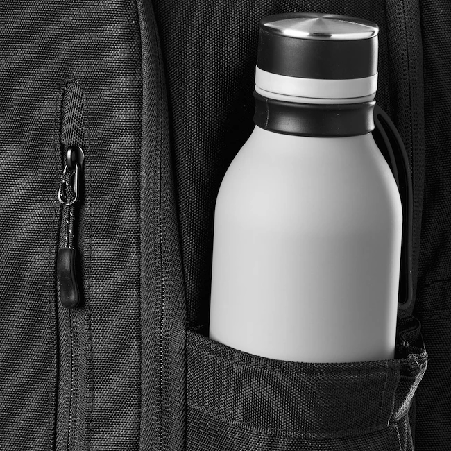 - Deux poches latérales avec expansion élastique pour bouteilles d’eau ou canettes avec balles
