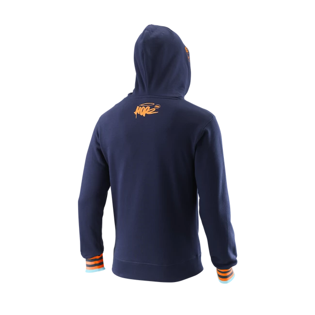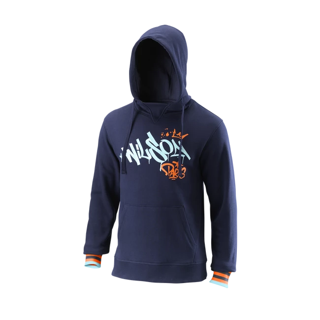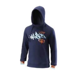 Sweat-shirt en polaire Wilson Paris Hope Peacoat pour homme avec capuche plissĂ©e pour une coupe ergonimo dans un mĂ©lange de coton et de polyester. Sweat-shirt Ă bordure libre autour du cou et col en V, manches colorĂ©es Ă rayures contrastantes et broderies/graffitis colorĂ©s sur la poitrine, le bord de la capuche et le dos sous le cou, fabriquĂ© dans l’atelier de l’artiste HOPE_1393.