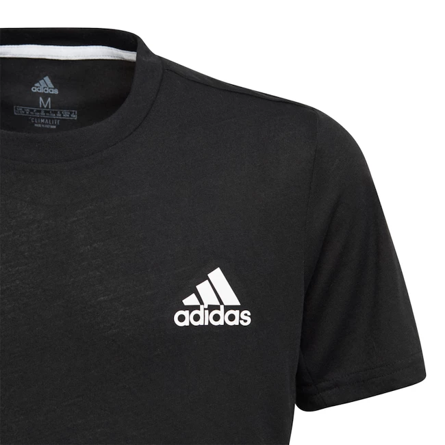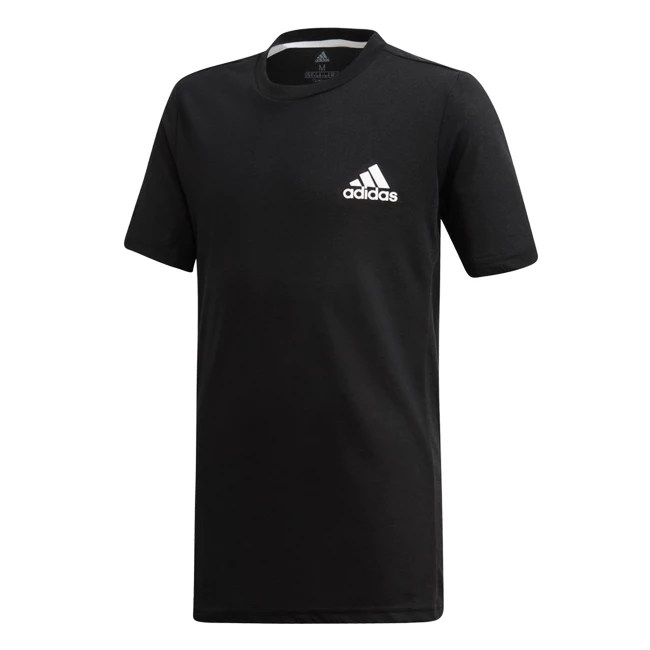 Le t-shirt présente un design noir traditionnel avec un logo adidas blanc sur la poitrine.